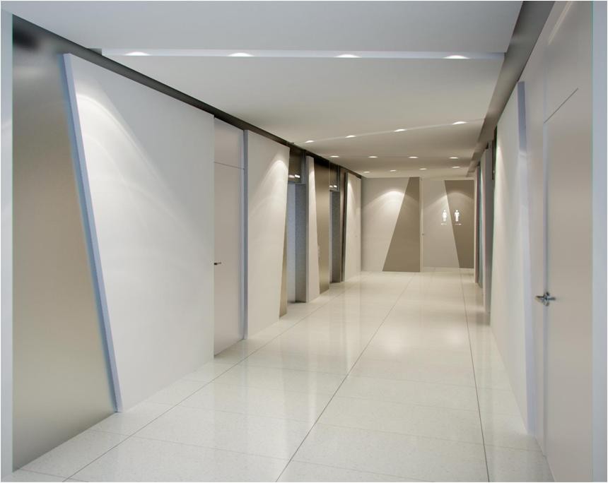 - Ceiling: Exposed concrete soffit, fire sprinkler system, FCU